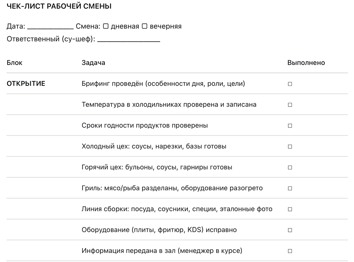 Профессиональный чек-лист смены всегда делится на три логические части: открытие, работаи закрытие. Каждый блок решает свои задачи и содержит конкретные, проверяемые пункты.