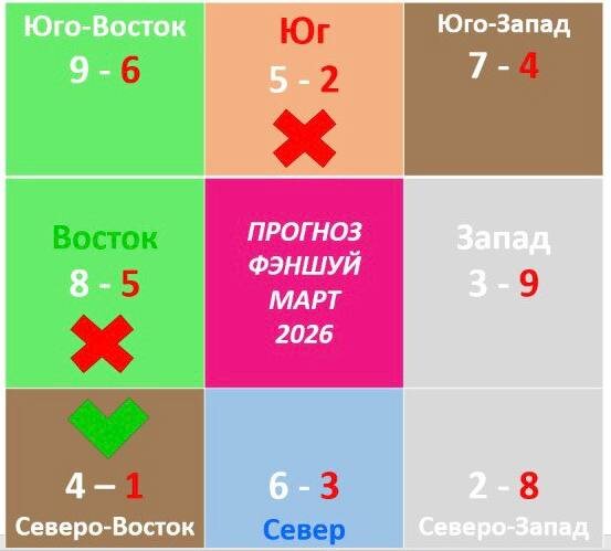 ) Дорогие друзья! Март 2026 года приходит под знаком Металлического Кролика, принося с собой энергию роста, гармонии и новых возможностей. Давайте составим карту энергий вашего дома, чтобы провести этот месяц максимально эффективно и безопасно. 💎 Навигатор по энергиям дома на март 💰 СЕКТОР БОГАТСТВА И ПАРТНЕРСТВА СЕВЕРО-ЗАПАД (Годовая 2, Месячная 8) Идеальное место для всего, что связано с деньгами! Здесь хорошо планировать бюджет, искать подработку или новых деловых партнеров. Тем, кто работает из дома, эта энергия поможет увеличить объем заказов и денег. 💞 СЕКТОР ЛЮБВИ И ПОМОЩНИКОВ СЕВЕРО-ВОСТОК (Годовая 4, Месячная 1) Ищете вторую половинку? Активнее используйте этот уголок! Для тех, кто в отношениях, здесь можно найти поддержку и укреплять связь. Также это отличное место для получения новых знаний. ✨ СЕКТОР РАДОСТИ И ПОБЕД ЗАПАД (Годовая 3, Месячная 9) Сектор-антистресс! Он принесет в вашу жизнь счастье, семейное тепло и поводы для праздника. Проводите здесь больше времени,