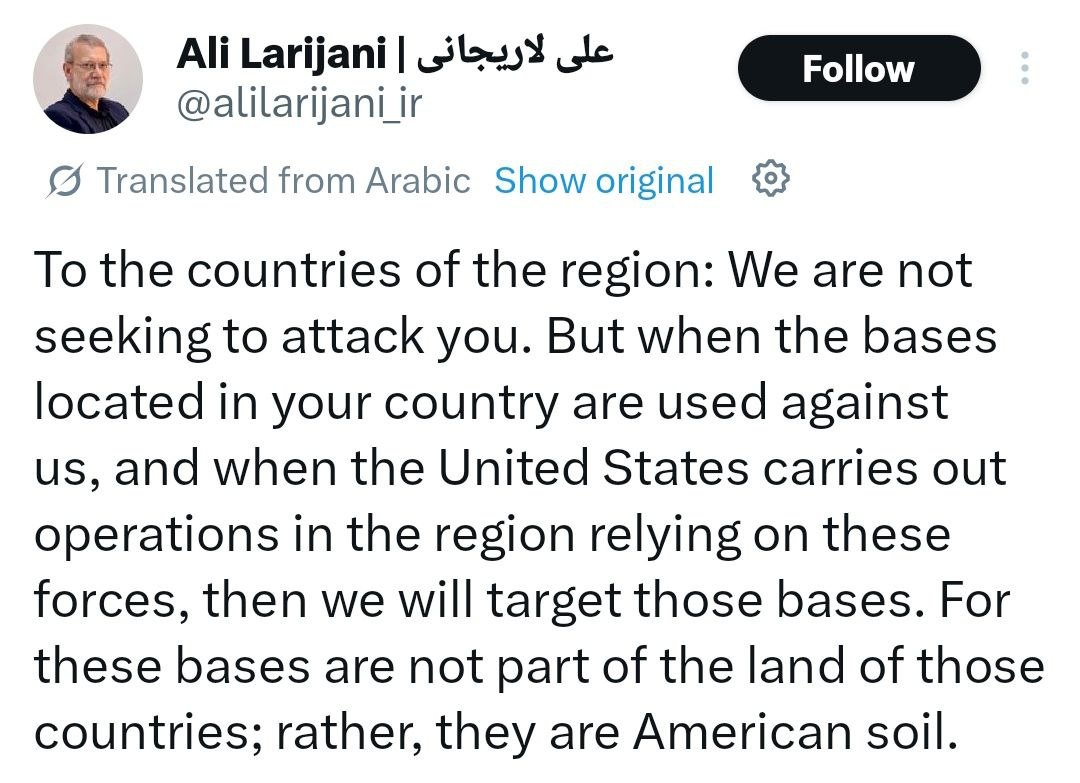 Top Iranian security official Larijani to countries of region: 'we are NOT seeking to attack you'