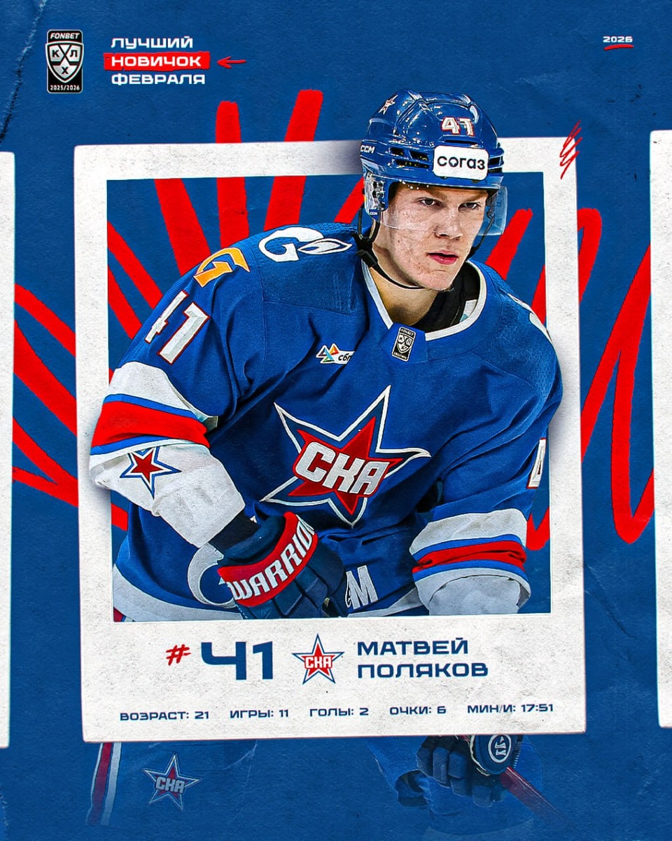 ⭐️ 21-летний Матвей Поляков набрал 6 (2+4) очков в 11 матчах февраля и впервые в карьере был признан лучшим новичком месяца в КХЛ!