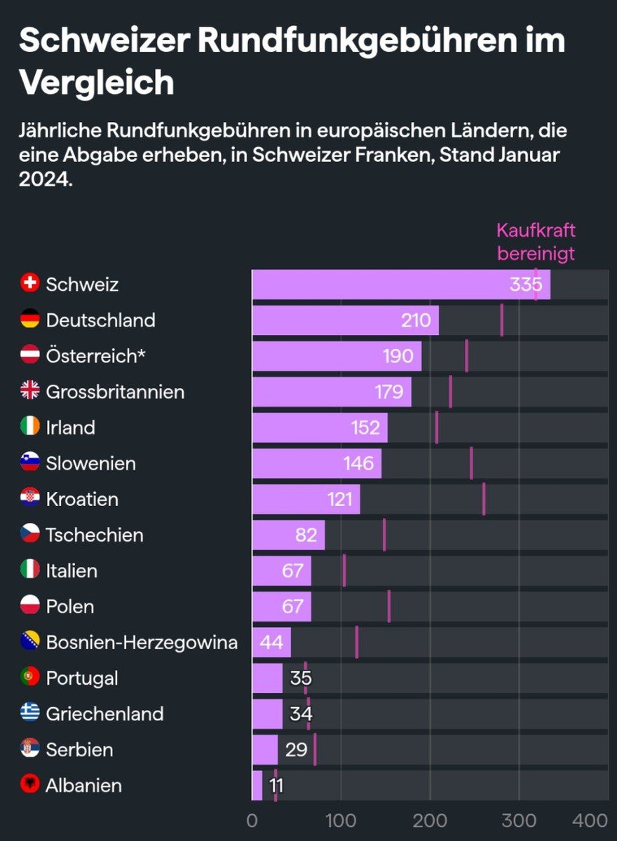 радио и телевидение — и поэтому их следует снизить. Лагерь противников возражает: нынешние сборы оправданы четырёхъязычием SRG. Но какова реальная ситуация по сравнению с соседними странами? Швейцария, Германия и Австрия: взносы домохозяйств В Швейцарии каждое домохозяйство платит 335 франков в год в виде сбора Serafe. Компании оплачивают взнос, зависящий от оборота. Из общей суммы поступлений в 2024 году около 1,29 миллиарда франков было направлено в SRG — из них SRF получил 560 миллионов, RTS — 415 миллионов, RSI — 285 миллионов и RTR — 25 миллионов франков. SRG ведёт вещание на четырёх языках для населения примерно 9,05 миллиона человек. В европейском сравнении видно: в Швейцарии сборы за вещание самые высокие — даже с учётом покупательной способности. В Германии каждое домохозяйство платит взнос за вещание в размере 18,36 евро в месяц (220,32 евро в год, около 200 франков по текущему курсу) — независимо от того, есть ли телевизор. Компании также платят взнос в зависимости от ч