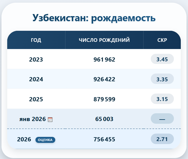 По итогам 2025 года количество рождений в Узбекистане снизилось на 5%. Казалось бы, тренд наметился, но январь 2026 года выдал аномалию: падение сразу на 14%. Если экстраполировать этот январь на весь год, цифры получаются исторические. Суммарный коэффициент рождаемости (СКР) может упасть с 3,15 в 2025 году до 2,71 в 2026-м. Почему это не просто сбой статистики По одному месяцу, конечно, рано хоронить демографический бум, но здесь важна системность. Падение рождаемости коррелирует с двумя другими показателями: - Браки в январе упали на 13,7%.