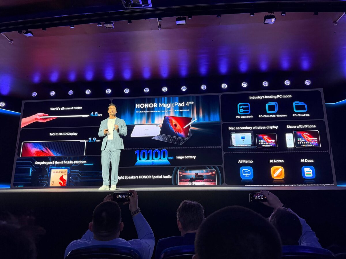 На MWC 2026 компания представила MagicPad 4 и MagicBook Pro 14 🔹 MagicPad 4 — всего 4,8 мм толщины, Snapdragon 8 Gen 5 и батарея 10 100 мАч 🔹 12,3″ AMOLED 3K с 165 Гц + 8 динамиков с пространственным аудио 🔹 Есть режим ПК, AI-инструменты и даже Linux Lab для экспериментов с ИИ 🔹 MagicBook Pro 14 — Intel Core Ultra Series 3 🔹 14,6″ сенсорный OLED и батарея 92 Вт·ч 🔹 AI-алгоритмы управления нагрузкой и питанием Оба устройства получили расширенную поддержку экосистемы Apple! Можно передавать файлы и использовать планшет как второй экран для Mac!