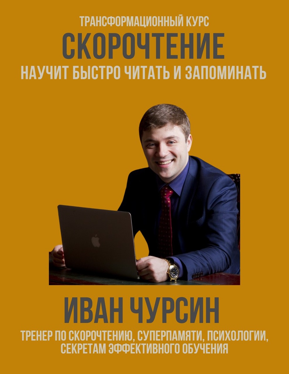 Иван Чурсин — педагог и психолог высшей квалификационной категории, тренер по скорочтению, суперпамяти и психологии эффективного обучения, практикующий с 2012 года. За годы работы обучение на его программах прошли более 200 000 человек. Курс направлен на развитие навыков быстрого чтения, запоминания и глубокого усвоения информации, повышение концентрации, продуктивности мышления и интеллектуальной эффективности. Подходит для предпринимателей, руководителей, специалистов, студентов и всех, кто работает с большими объёмами информации и стремится учиться быстрее и качественнее. Контакты по запросу.