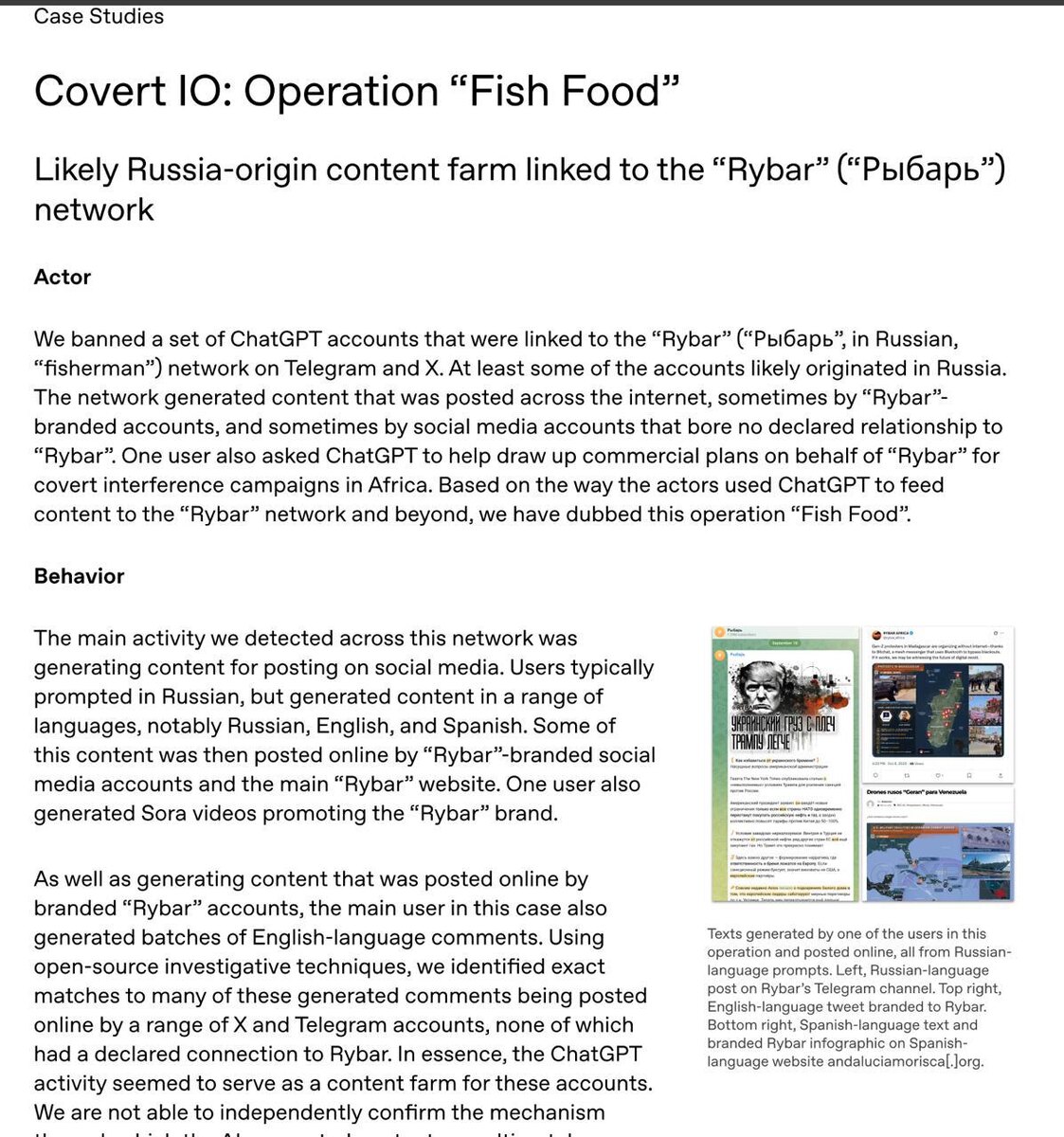 ChatGPT Рыбаря Рыбарь, который одит лекции читает по информационному воздействию и влиянию, через ИИ разрабатывал схемы переворотов в странах Африки: Помимо создания контента, основной аккаунт операции также попросил ChatGPT перевести на английский язык список услуг, которые «Rybar» мог бы предложить неназванным клиентам, включая ведение аккаунтов X и Telegram, двуязычный веб-сайт «журналистских расследований», посвященный Африке, платные публикации во франкоязычных СМИ и сеть распространителей информации. Отдельное задание просило модель отредактировать предложение по созданию, по-видимому, группы по вмешательству в выборы, предположительно, в Африке. Это предложение включало в себя деятельность как на местах, так и в интернете, например, создание сети местных агентов и организацию масштабных мероприятий. Третье задание касалось информационной кампании, посвященной Демократической Республике Конго (ДРК). Дальнейшие задания касались избирательного процесса в Бурунди и Камеруне и н