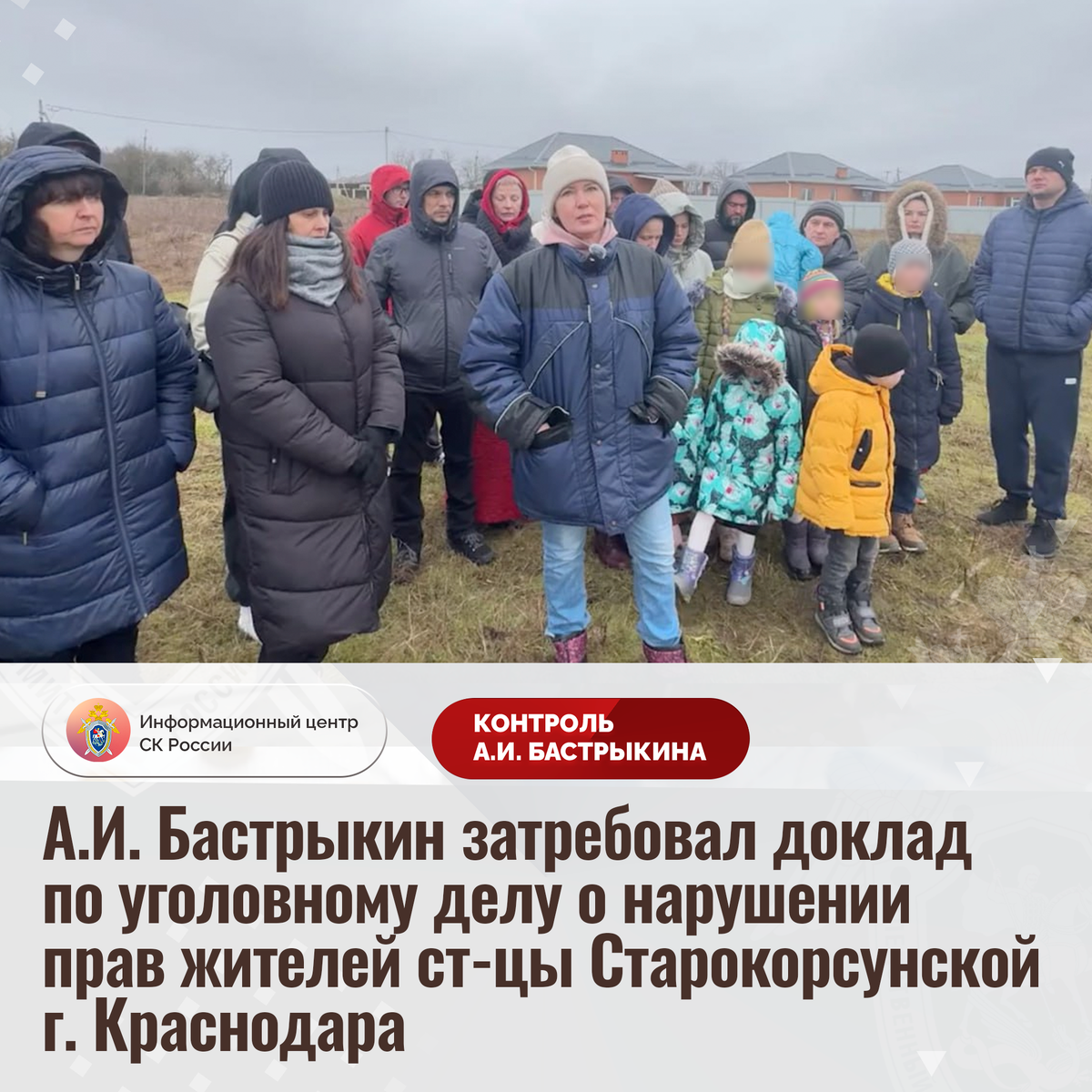 А.И. Бастрыкин затребовал доклад по уголовному делу о нарушении прав жителей ст-цы Старокорсунской г. Краснодара В социальной сети размещено видеообращение к Председателю СК России А.И. Бастрыкину жителей станицы Старокорсунской города Краснодара по вопросу нарушения их прав. Ранее граждане приобрели у частного лица земельные участки на улице Таврической, в том числе за счет ипотечного кредитования и материнского капитала, где некоторые из них возвели домовладения. Однако в 2024 году в связи с ранее допущенными нарушениями при выделении земли граждан признали недобросовестными приобретателями. В результате собственники, в числе которых многодетные семьи, лишились единственного жилья и не могут получить компенсационные выплаты. В СУ СК России по Краснодарскому краю возбуждено уголовное дело. Председатель Следственного комитета Российской Федерации Александр Иванович Бастрыкин затребовал у руководителя СУ СК России по Краснодарскому краю Андрея Константиновича Маслова доклад о ходе и ре