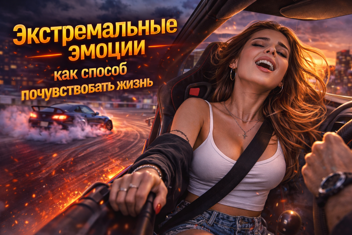 Есть только «сейчас». Девушка садится в дрифт-такси. Сначала — интерес. Потом первый резкий угол. И в эту секунду жизнь становится концентрированной. Современная жизнь безопасна. Предсказуема. Стабильна. И это хорошо. Но у мозга есть древняя часть, которая жаждет интенсивности. Ей нужно чувствовать, что ты живой, а не просто существуешь. Экстрим возвращает контакт с телом. Ты чувствуешь: Это чистое присутствие. Важно понимать: экстремальные эмоции ценны, когда они управляемы. В дрифт-такси это не без