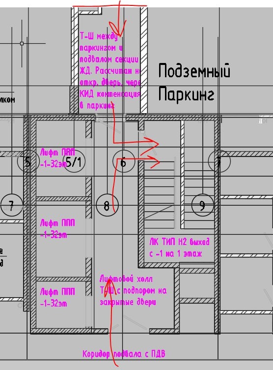 Нашла в консультациях хороший пример организации ПДВ при выходе ЛШ в стоянку и блок кладовых. В этом случае, как мы знаем, подпор по отношению к стоянке выполняется на открытую дверь в тамбур-шлюз и на закрытую дверь в лифтовый холл. Так и сделано в проекте. Однако, со стороны коридора подвала сообщение его с ЛШ должно быть выполнено через лифтовый холл с подпором на открытую дверь, так как: 1) ЛШ имеет режим ППП 2) ЛХ является путем эвакуации из коридора в лестничную клетку, что обуславливает возможность эксплуатации данного ЛХ в подвале с открытой дверью. В таком случае ошибочно полагать, что подпор в ЛХ должен выполняться только на закрытую дверь, как для случая, описанного в СП7 при выходе из ЛШ в автостоянку. Ситуация такая с нагромождением подпоров и необходимостью куда-то сбрасывать лишний расход или городить по две системы подпора в ТШ и ЛХ происходит из-за того, что проектировщик ПДВ не знает или не умеет работать с архитектурными решениями. Иногда я еще слышу, что подпор