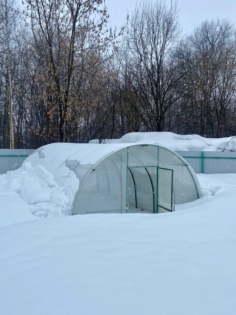 Теплицу за зиму очищал от снега три раза, ну и заодно накидал в неё снега, получилось сантиметров 30-40.