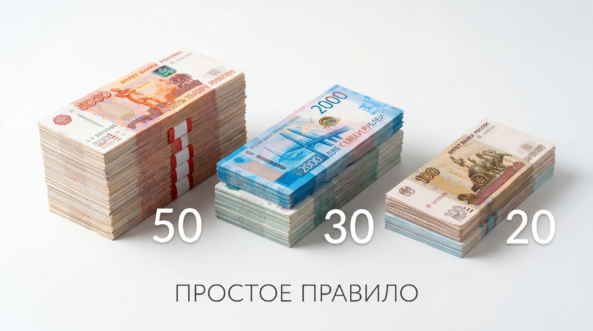 Я раньше думал что планирование бюджета это что-то очень сложное. Таблицы, категории, подкатегории, формулы в экселе. Попробовал пару раз и бросил. Слишком муторно. А потом наткнулся на правило 50 30 20. И всё встало на свои места. Не нужен сложный бюджет. Нужны три цифры. И ты уже контролируешь деньги. Это простая формула распределения дохода. Придумала её американский сенатор Элизабет Уоррен ещё в начале 2000-х. Но работает она до сих пор и в России тоже. Суть простая. 50 процентов уходит на обязательные расходы. Аренда, коммуналка, еда, проезд, кредиты. Всё то без чего никак не обойтись. 30 процентов на желаемое. Кафе, одежда, развлечения, подписки, хобби. То что делает жизнь приятной. 20 процентов на будущее. Подушка безопасности, накопления, инвестиции, досрочное погашение долгов. Всё. Больше ничего считать не надо. Я понимаю что теория это одно, а жизнь другое. Поэтому давай разберём три конкретных примера. Доход 30 000 рублей 50% это 15 000 на обязательное. Аренда комнаты или ип