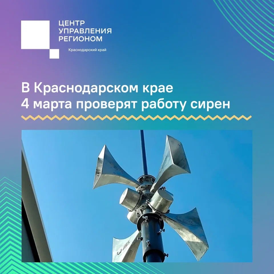 В среду в 10:40 и 11:10 во всех муниципалитетах региона будут запущены сирены, предупреждающие об опасности. Жителей и гостей Краснодарского края просят сохранять спокойствие при появлении звука сирен. Все сигналы являются учебными.