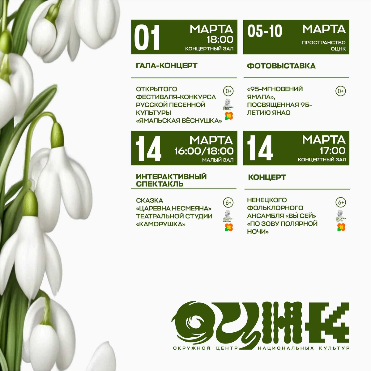 📆 Весна наступает, а с ней - наша новая подборка вдохновения! Сохраняйте список, делитесь с близкими и планируйте досуг! Приобрести билеты и забронировать места можно по ссылкам ниже 👇 🤩гала-концерт открытого фестиваля-конкурса русской песенной культуры «Ямальская вёснушка»: clck.ru/3SAptB; 🤩фотовыставка «95-мгновений Ямала», посвященная 95-летию ЯНАО, вход свободный; 🤩концерт «По зову полярной ночи» ненецкого фольклорного ансамбля «Вы’ сей»: clck.ru/3SArYT; 🤩интерактивный спектакль сказка «Царевна Несмеяна» театральной студии «Каморушка»: clck.ru/3SApxs; 🤩концерт «Нить традиций» ансамбля танца народов Северного Кавказа «Сияние гор»: clck.ru/3SArah; 🤩«Тематические встречи» квартирник «Матрёны Ивановны», ссылка на билеты появится в ближайшее время, следите за нашими новостями!; 🤩социальная драма «Семья вурдалака» театра-студии «Каморка» и театральной студии «Каморушка»: clck.ru/3SArh3; 🤩тематическая смена «Медиасмена» запись по ссылке: clck.ru/3SB26U. 📌билеты можно прио