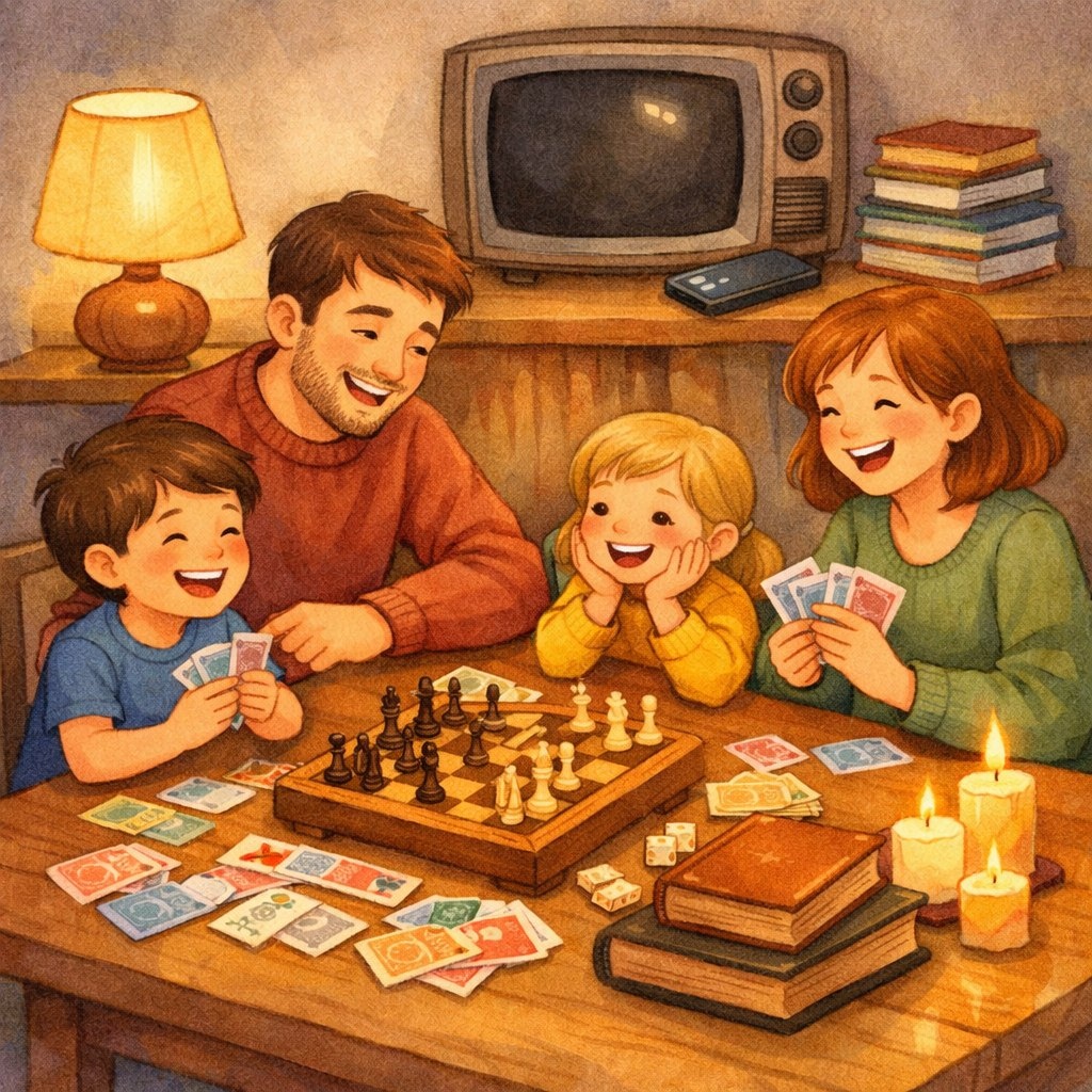 Π‘Π΅ΠΌΡΡ, ΠΏΠΎΠ½Π°ΡΠ°Π»Ρ ΡΠ°ΡΡΠ΅ΡΡΠ½Π½Π°Ρ, Π·Π°ΠΆΠ³Π»Π° ΡΠ²Π΅ΡΠΈ. Π Π² ΡΠ΅ΠΏΠ»ΠΎΠΌ, ΠΆΠΈΠ²ΠΎΠΌ ΡΠ²Π΅ΡΠ΅ ΠΏΠ»Π°ΠΌΠ΅Π½ΠΈ ΠΎΠ½ΠΈ Π΄ΠΎΡΡΠ°Π»ΠΈ Π¨Π°Ρ ΠΌΠ°ΡΡ. ΠΠ°ΠΏΠ° ΡΡΠΈΠ» ΡΡΠ½Π° Ρ ΠΎΠ΄Ρ ΠΊΠΎΠ½Ρ. ΠΠΎΡΠΎΠΌ ΠΈΠ³ΡΠ°Π»ΠΈ Π² Β«ΠΡΠΎΠΊΠΎΠ΄ΠΈΠ»Π°Β» Ρ ΠΏΠΎΠΌΠΎΡΡΡ ΡΠ²Π΅ΡΠ½ΡΡ ΡΠ΅Π½Π΅ΠΉ Π½Π° ΡΡΠ΅Π½Π΅ (ΡΡΡ ΠΏΠΎΠ΄ΠΊΠ»ΡΡΠΈΠ»ΠΎΡΡ Π²ΠΎΠΎΠ±ΡΠ°ΠΆΠ΅Π½ΠΈΠ΅ ΠΎΡ ΠΠ½ΠΈΠ³ΠΈ!). Π Π°ΡΡΠΊΠ°Π·ΡΠ²Π°Π»ΠΈ ΡΡΡΠ°ΡΠ½ΡΠ΅ ΠΈΡΡΠΎΡΠΈΠΈ (ΡΠ΅Π»Π΅Π²ΠΈΠ·ΠΎΡ ΠΎΡΠ΄ΡΡ Π°Π», Π·Π°ΡΠΎ ΡΠ°Π±ΠΎΡΠ°Π»ΠΎ ΡΠ°ΠΌΠΎΠ΅ ΡΡΠ°ΡΠΎΠ΅ Β«ΡΡΡΡΠΎΠΉΡΡΠ²ΠΎΒ» β ΡΠ΅Π»ΠΎΠ²Π΅ΡΠ΅ΡΠΊΠ°Ρ ΡΠ΅ΡΡ). Π ΡΠΌΠ΅ΡΠ»ΠΈΡΡ ΡΠ°ΠΊ, ΠΊΠ°ΠΊ Π΄Π°Π²Π½ΠΎ Π½Π΅ ΡΠΌΠ΅ΡΠ»ΠΈΡΡ.