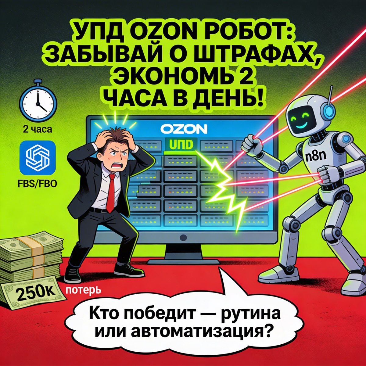 2026 года карают жестко за задержки и ошибки в 20% случаев. Наш кастомный робот на n8n + API Ozon ставит на автопилот всю рутину: автопарсинг заказов, формирование УПД за 30 сек, ловлю 95% слотoв FBO. Окупаемость 3-7 дней, разовая разработка под ключ без ежемесячных подписок. Хватит быть бухгалтером - заказывай автоматизацию и масштабируйся! Подписывайся на нас и автоматизируй свои продажи: Сайт: https://ozon-wb-ym.tb.ru Вконтакте: https://vk.com/seller_ozon_wb_ym Дзен: https://dzen.ru/ozon_wb_ym #MadBrainyAI #Ozon #Wildberries #n8n #АвтоматизацияМаркетплейсов #УПД #FBOслоты