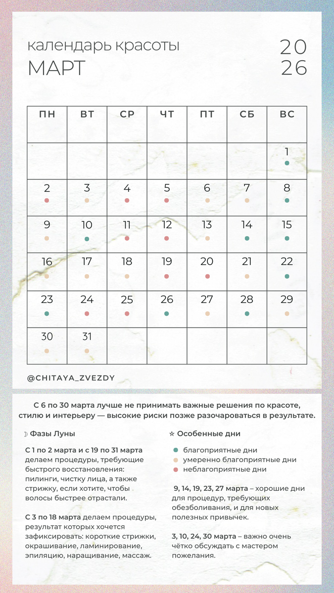 🌿 Наконец дождались весну и душа просит обновлений? Новую причёску, свежий цвет волос, ремонт или хотя бы перестановку? Не спешите⛔️ С 6 по 30 марта Венера будет в слабом положении. А вместе с этим и наш вкус может стать, скажем так, своеобразным. Это как раз тот период, когда внезапно начинают нравиться ядовитые оттенки лака, появляются идеи сделать кухню оранжевой, а в корзине оказывается диван цвета сладкой ваты — и в моменте всё кажется гениальной находкой. Проблема в том, что под такой Венерой нам сложно объективно оценивать эстетику. Хочется ярче, смелее, необычнее — но спустя время результат крайне удивит. Поэтому если в этот период вас накрывает желанием кардинально обновить стиль, затеять ремонт или радикально сменить причёску — лучше дать себе паузу до 31 марта. В этот день Венера станет гармоничной, и принятые решения будут гораздо более взвешенными и долговечными. ➡️ А чтобы выбрать лучшие даты для бьюти процедур в марте, опирайтесь на мой календарь красоты — удачных дней