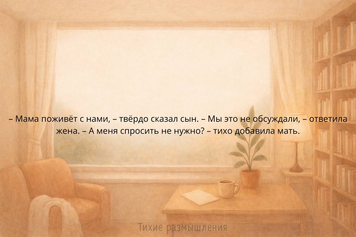 Я думала о том, каково ей будет — свекровь в доме, каждый день, за одним столом, в одной ванной, в одном пространстве. Думала и понимала: непросто. Даже если она женщина терпеливая и незлобная. Даже если искренне хочет помочь.