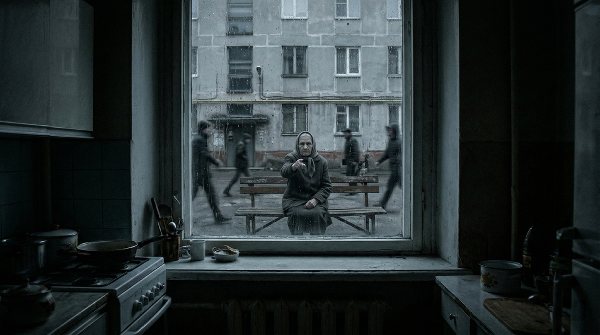 Я живу в типовой пятиэтажке, в квартире, где окна выходят во двор. Обычный двор: детская площадка, три старых тополя и лавочка у подъезда, вросшая в землю. На этой лавочке, сколько я себя помню, сидела тетя Валя. Тихая, незаметная пенсионерка в неизменном сером платке и старой кофте, в любую погоду. Я всегда считал её частью дворового ландшафта, безобидным фоном. Я ошибался. Это началось вчера. Я сидел у окна на кухне, тупо глядя во двор. Был обычный серый день. Запах прелых листьев пробивался даже сквозь пластиковые рамы. Тетя Валя сидела на своем месте. Из первого подъезда вышел Серега — мой сосед, вечно спешащий, дерганый парень. Он поднял руку, чтобы поправить капюшон. В ту же секунду тетя Валя, сидевшая неподвижно, подняла свою руку и сделала абсолютно то же самое движение. Тот же угол сгиба локтя, та же скорость. Она не повторяла за ним. Она была синхронна с ним, словно была его отражением в зеркале, которое вдруг материализовалось во дворе. Но зеркало было по другую сторону. Сер