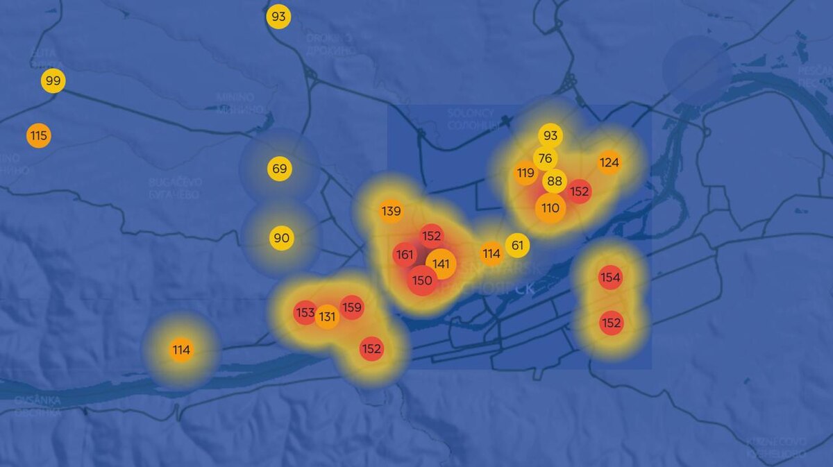 Так сейчас выглядит карта nebo.live. Превышения по загрязнению воздуха фиксируют во всех районах Красноярска.