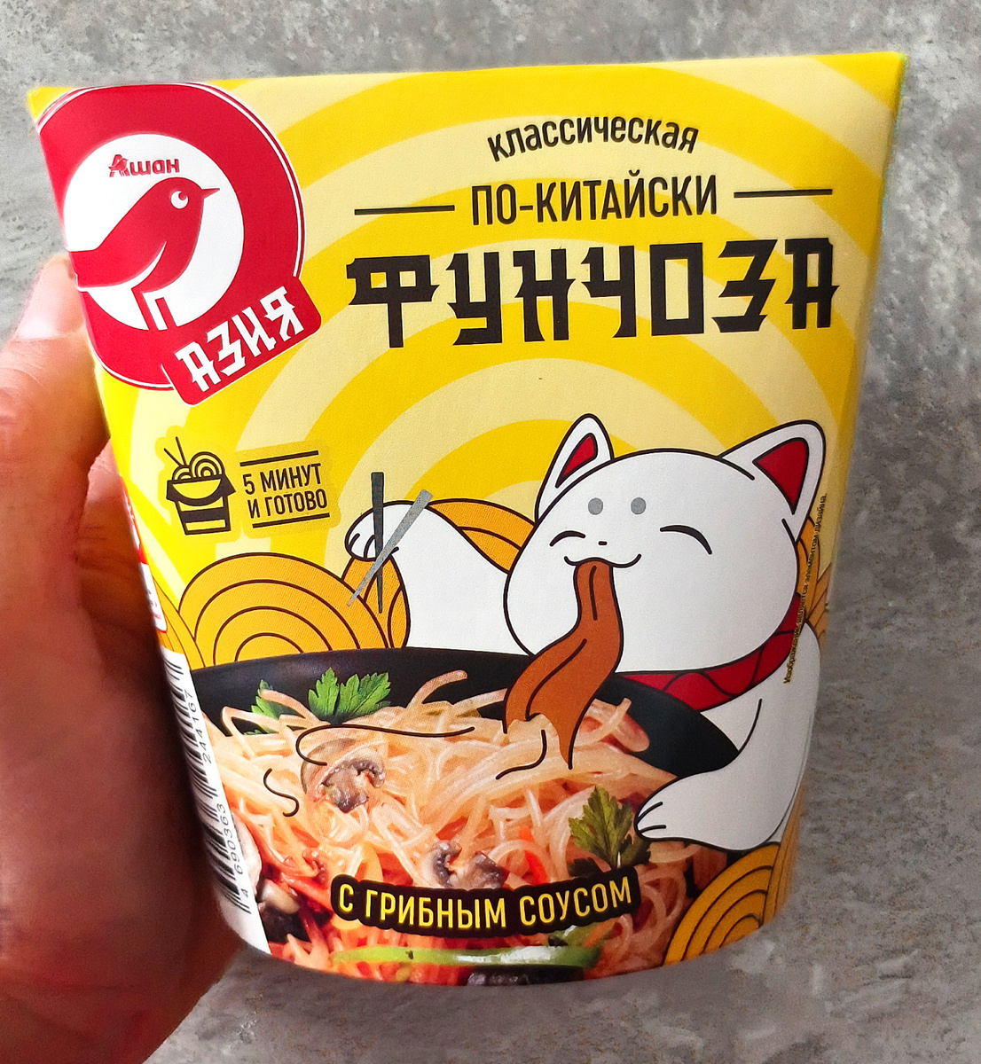 Прикупил в Ашане на пробу классическую фунчозу с грибным соусом. Обошлась в 99 рублей по акции. Китайская кошечка с длинным языком одобряет, значит будет вкусно.
