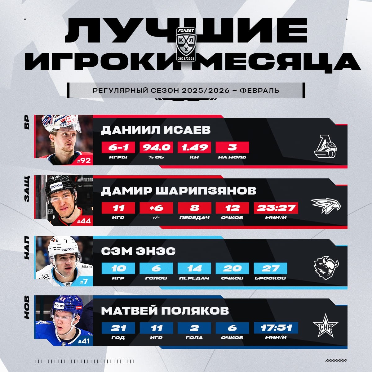 Привет, друзья! Февраль в КХЛ был насыщен яркими моментами, и настало время узнать, кто же стал настоящими звёздами месяца. Лучшим вратарём признан Даниил Исаев из «Локомотива», который одержал шесть побед в восьми матчах с коэффициентом надёжности 1,49. Это говорит о том, что Исаев не просто защищал ворота, а активно участвовал в игре, спасая свою команду в самых напряжённых моментах. Лучшим защитником стал Дамир Шарипзянов из «Авангарда», набравший 12 (4+8) очков в 11 матчах. Это не просто цифры, это показатель того, что Шарипзянов не только обороняется, но и активно атакует, внося свой вклад в успех команды. Лучшим нападающим впервые в карьере признан Сэм Энэс из минского «Динамо», набравший 20 (6+14) очков в десяти матчах. Это говорит о том, что Энэс не просто забивал голы, но и раздавал результативные передачи, помогая своей команде набирать очки. Лучшим новичком признан Матвей Поляков из СКА, набравший 6 (2+4) очков в 11 матчах. Это показывает, что Поляков быстро адаптировался в