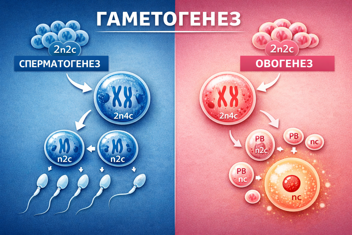 СПЕРМАТОГЕНЕЗ 1. ПЕРИОД РАЗМНОЖЕНИЯ Сперматогонии активно делятся митозом. Хромосомный набор после митоза в клетках 2n2c. 2. ПЕРИОД РОСТА Во время этого периода происходит интерфаза (подготовка к последующему мейозу). Клетки растут, накапливают питательные вещества, происходит удвоение ДНК. Клетки дифференцируются в сперматоциты 1-ого порядка (первичные сперматоциты). Набор 2n4c. 3. ПЕРИОД СОЗРЕВАНИЯ Происходит два последовательных деления мейозом. В результате 1-ого деления деления мейоза образуется ДВА одинаковых СПЕРМАТОЦИТА второго порядка (набор n2c). Каждый из них в результате 2-ого деления формирует по 2 СПЕРМАТИДЫ. ИТОГ – 4 сперматиды с набором nc. Не забываем про конъюгацию и кроссинговер в профазе мейоза 1. 4. ПЕРИОД ФОРМИРОВАНИЯ Сперматиты превращаются в сперматозоиды. ОВОГЕНЕЗ 1. ПЕРИОД РАЗМНОЖЕНИЯ Овогонии активно делятся митозом. Хромосомный набор после митоза в клетках 2n2c. Происходит внутриутробно. 2. ПЕРИОД РОСТА Во время этого периода происходит интерфаза (подготов