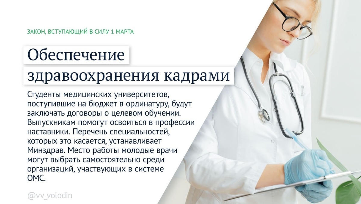 С 1 марта вступил в силу соответствующий запрет, направленный на повышение качества медицинского образования. С 1 марта в стране не должно применяться электронное и дистанционное обучения в медицинском и фармацевтическом образовании. Врачи, фельдшеры и медсёстры должны обучаться у аттестованных преподавателей в университетах и колледжах, которые имеют клиническую базу для практики. Поступившие в ординатуру на бюджетной основе будут заключать договоры о целевом обучении, место работы они выберут самостоятельно среди учреждений, которые лечат по ОМС. Также сегодня вступил в силу закон о русскоязычных вывесках.