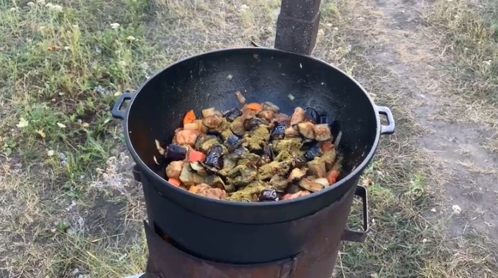 - Накрыть казан крышкой и тушить 1–1,5 часа на слабом огне. Помидоры и баклажаны дадут сок, и жидкости будет достаточно, чтобы ничего не пригорело.