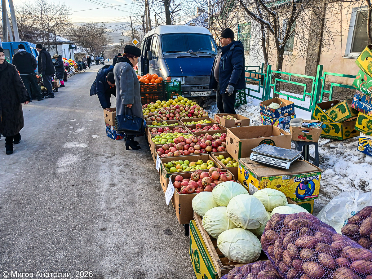 Утро первого дня весны-2026 в городке Старый Крым было не совсем весенним. Холодным было это утро и снег ещё вовсю лежал на обочинах. Потом только, к полудню, солнце вспомнило, что наступил март, и начало не по-зимнему припекать. Но я был на рынке в восемь, так что народ не спешил расставаться с шапками, куртками и тёплыми пальто. Как всегда я начал обход рынка с его центральной части. Рынок у нас под открытым небом, продуваем ветрами. Торговцы ставят навесы и павильоны своими силами. Хорошо ещё, что есть асфальт, а ведь когда мы сюда впервые попали - это было ещё в украинские времена - тут были ямы и лужи. Первым делом иду за домашней курицей. Цены на неё пока остаются неизменными - 400 руб/кг. Попутно интересуюсь стоимостью сопутствующих продуктов: Яйца, кстати, видел на рынке и по 120 рублей. Красивый натюрморт - тыквы на снегу. Надо сказать, не вполне крымский этот натюрморт. Я пока ходил по рынку, перекинулся несколькими словами о погоде с торговцами, нигде в окрестных сёлах сне