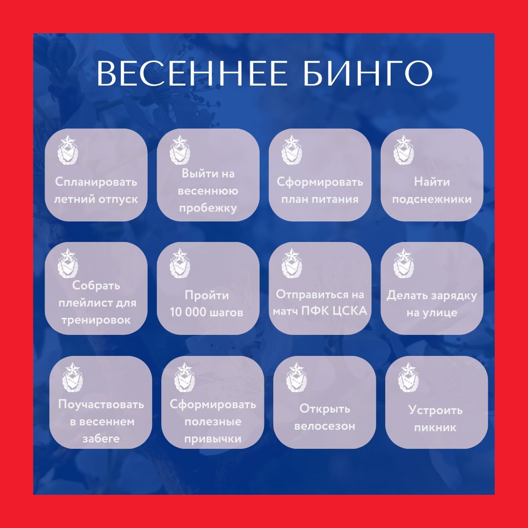 Сегодня официально проснулась весна, а значит, пора составлять планы на весенний сезон! 🌷☀️ Мы собрали для вас идеальное «Весеннее бинго» — чек-лист того, что нужно успеть в ближайшие три месяца. Сохраняйте картинку, вычеркивайте пункты, которые уже сделали, и отправляйтесь на новые свершения. Главный пункт программы: обязательно внести матч ПФК ЦСКА в календарь! Без футбола весна не считается 🔴🔵 Делитесь своими успехами в комментариях!⬇️