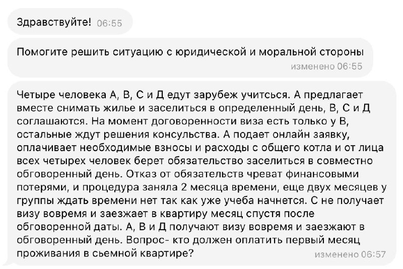 Товарищи, история про финансовые обязательства. Если есть юристы — помогайте. В остальное обсуждаем как обычно — по зову сердешек. Суть: будущие студенты решили снять квартиру на четверых. Из-за бумажных процедур трое заселились вовремя, а четвертый через месяц. Вопрос автора: кто должен оплатить первый месяц проживания в съемной квартире? П. С. По поводу прошлой истории про отношения. Прошу прощения у автора: я запоздала с разбором, а когда вчера села разбирать, оказалось, что по мою душу ничего и нет. Поэтому свое мнение дать не смогу.