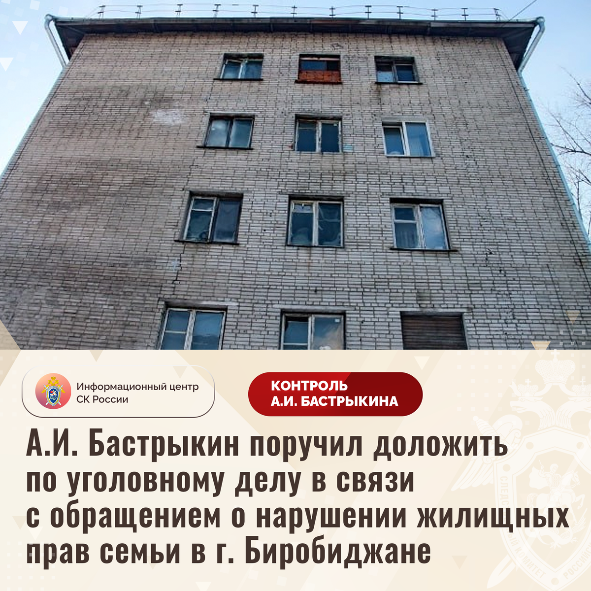 А.И. Бастрыкин поручил доложить по уголовному делу в связи с обращением о нарушении жилищных прав семьи в г. Биробиджане