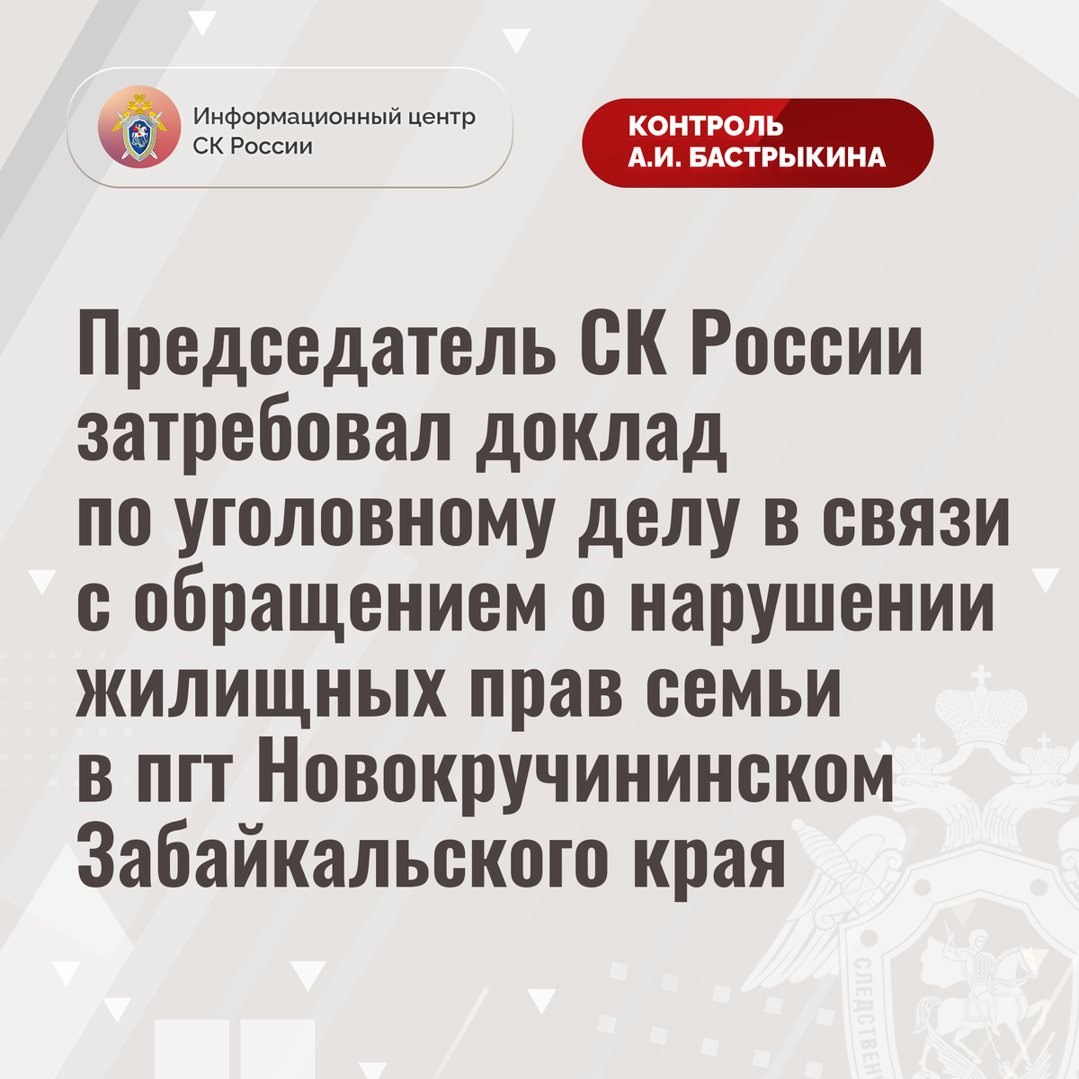Председатель СК России затребовал доклад по уголовному делу в связи с обращением о нарушении жилищных прав семьи в пгт Новокручининском Забайкальского края В Информационный центр СК России обратилась жительница поселка городского типа Новокручининский Забайкальского края, воспитывающая четверых детей, по вопросу непредоставления ей положенного по закону жилья. Более 10 лет женщина состоит на учете лиц, нуждающихся в обеспечении жилым помещением, однако до настоящего времени ее права не реализованы. В результате заявительница вынуждена арендовать квартиру за свой счет, что для нее финансово затруднительно. Обращения в уполномоченные органы результатов не принесли. В СУ СК России по Забайкальскому краю возбуждено уголовное дело. Председатель Следственного комитета Российской Федерации Александр Иванович Бастрыкин поручил руководителю СУ СК России по Забайкальскому краю Алексею Юрьевичу Вольному доложить о ходе и результатах расследования уголовного дела. Исполнение поручения поставлено