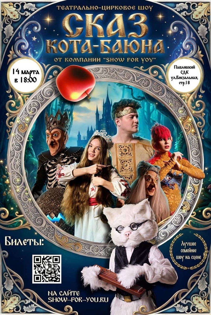 ✨ Пройдет театрально-цирковое шоу «Сказ Кота-Баюна» Приглашаем на тёплое театрально‑цирковое семейное шоу от Show for you — душевная история, где любимые герои русского фольклора оживают на сцене. Что вас ждёт: - ⚡ Тесла‑шоу — научные чудеса и искры; - 🌈 Световое и неоновое оформление сцен; - 🧪 Научные фокусы и зрелищные эксперименты; - 🫧 Мыльное шоу с волшебными пузырями; - 🎪 Цирковые номера и живые актёры; - 🎥 Красивые визуальные ряды и эмоциональные сцены. 📆 14.03.2026🕒18:00 🏢 Павловский сельский дом культуры (СДК) 📍 г.о.Домодедово, дер.Павловское, ул.Вокзальная, д.18 💰 Цена от 800 ₽ 🎫 Купить билет: https://istra.qtickets.events/218383-shou-skazka-skaz-kota-bayuna ✅ Мероприятия Домодедово https://dzen.ru/id/66f10385cc4c5a16f7b5fb02 http://vk.com/domodedovo_events http://dzen.ru/domodedovo_events