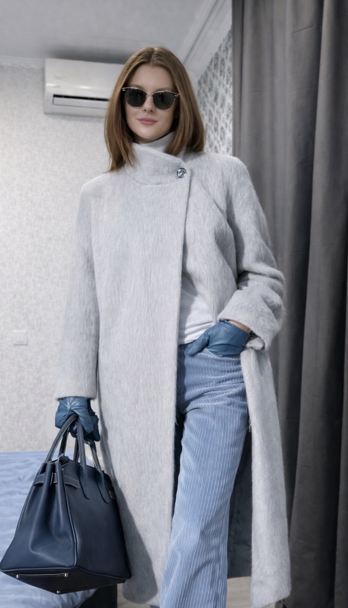 Оттенок не чисто белый и не графитовый, а деликатный холодный светло-серый с лёгким сливочным подтоном. Текстура напоминает мягкий ворс — она визуально «согревает» холодную гамму и добавляет образу объём. За счёт матовой поверхности пальто становится идеальным фоном для игры других материалов.