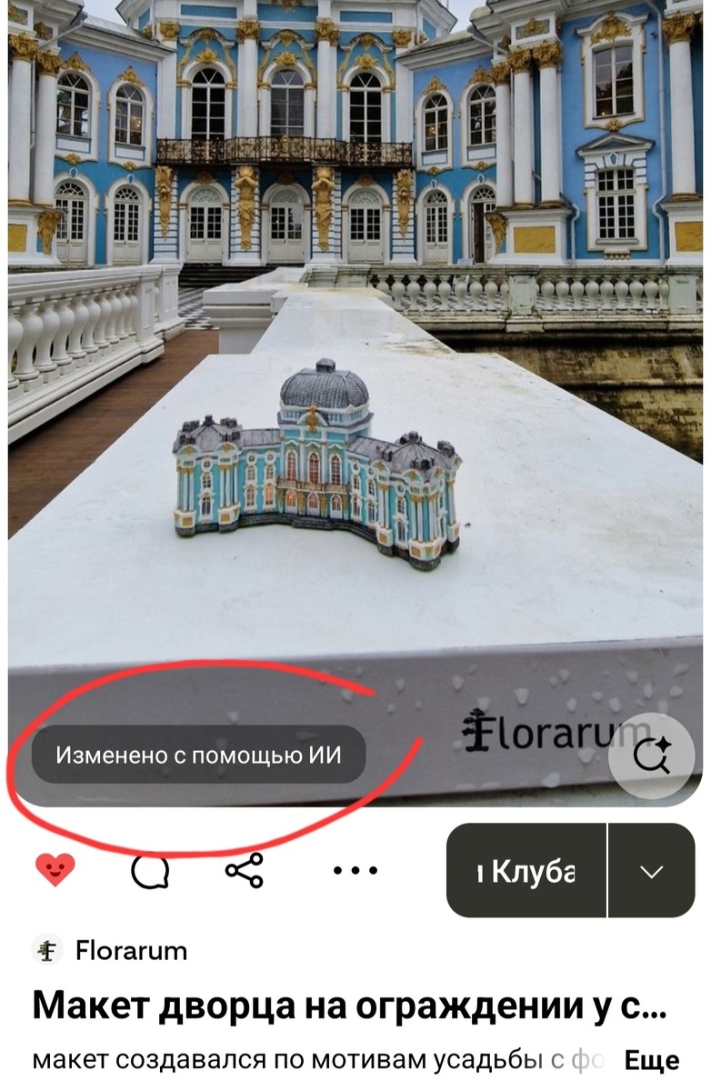 На русском языке написано вроде бы безобидно. Подумаешь, "изменено". Но в англ. версии всё чётко: Gen AI, сгенерировано нейросетью Носить подобную метку на своей фотографии я не намерена. Три месяца на создание дворца, поездка в другой город, фотографии под дождем (картонному дворцу это не особо полезно), чтобы в итоге "сгенерировано". Тем более это имеет практическую подоплёку: у рукоделия и генерашек разные целевые аудитории.