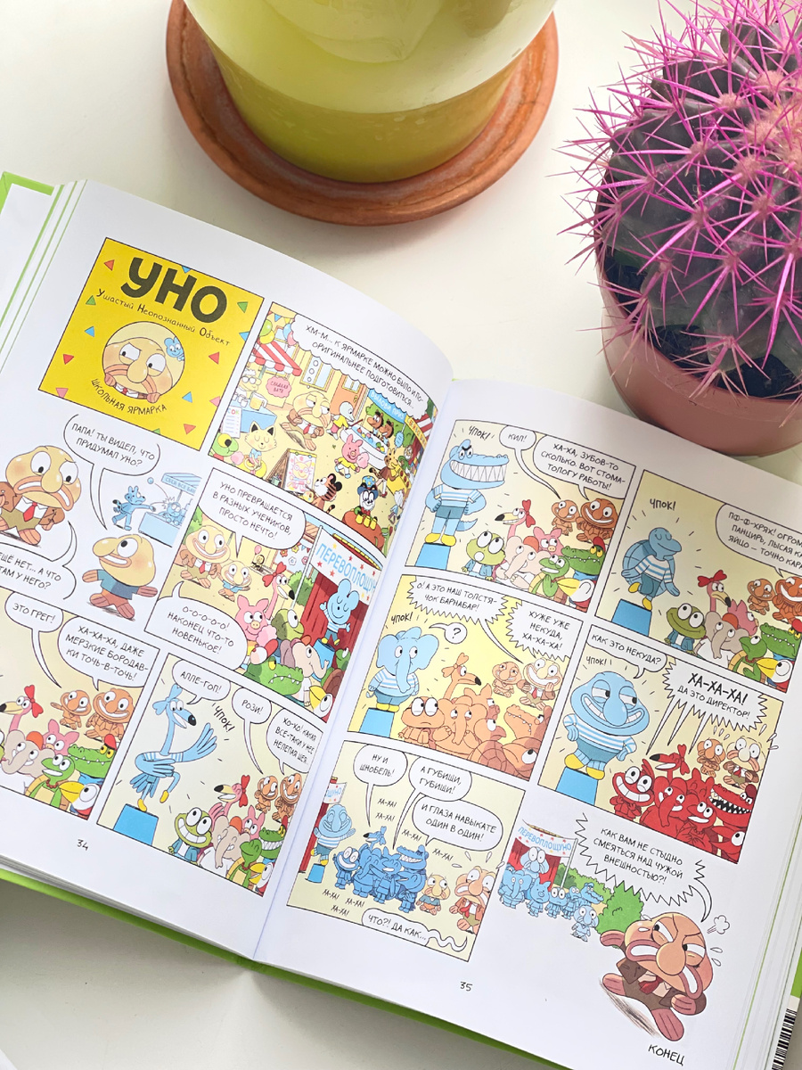 «Уно: неугомонный спасатель» — это формат мини-комиксов: короткие истории, разбитые по темам. Читать легко. Текста немного. Иллюстрации цветные, живые, эмоциональные.