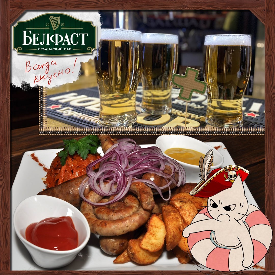 "! Питер Блад не только пиратский капитан, но и доктор, а доктор всегда знает, что нужно дружной команде в начале рабочей недели. Конечно же мясо и другие съестные припасы! «Питер Блад» это груда из Альпийских колбасок, Крайнских колбасок, колбасок Дебрецинер, куриных колбасок с перцем, квашеной капусты, картофеля по-деревенски и красного лука, сдобренная кетчупом, горчицей и зеленью — и по понедельникам это сокровище станет вашим со скидкой в целых 25%! А также возвращение любимой акции с пивом 2+1! Спасибо, капитан! http://belfast-pub.ru/ Другие акции: вск и пнд: пиво 2+1 втр: -25% на вино срд: -25% на рульку . #belfast_pub #паб #какмылюбим #акция #капитанблад #подарок #колбаски