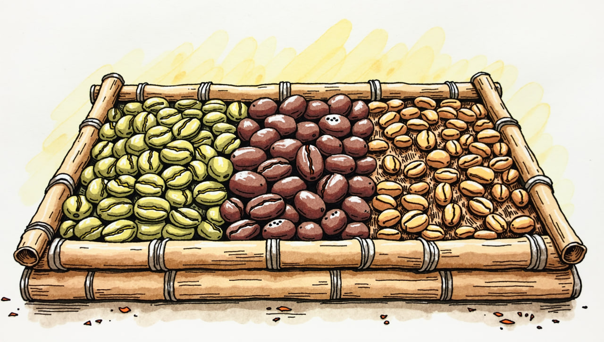 Чёрные, блестящие зёрна выглядят убедительно. Они пахнут дымом, горьким шоколадом, жареным хлебом. Уже один аромат обещает силу. Рядом лежат светлые, матовые бобы цвета сухой пшеницы. Их запах тоньше, сложнее, иногда с намёком на ягоды или цитрус. Интуиция подсказывает простой вывод: тёмное значит крепкое, светлое значит слабое. Именно так и рождается один из самых живучих кофейных мифов. На самом деле цвет обжарки почти не связан с количеством кофеина. Что происходит с кофеином во время обжарки Когда зелёное зерно попадает в ростер, внутри начинается целая цепочка превращений. Влага испаряется, сахара темнеют и карамелизуются, кислоты распадаются или меняют форму. Формируется вкус, который мы потом называем ореховым, шоколадным или дымным. Кофеин ведёт себя иначе. Он гораздо устойчивее к температуре, чем многие ароматические соединения. Даже при глубокой обжарке его потери невелики. Разница между очень светлой и очень тёмной обжаркой обычно укладывается в несколько процентов. В пересч