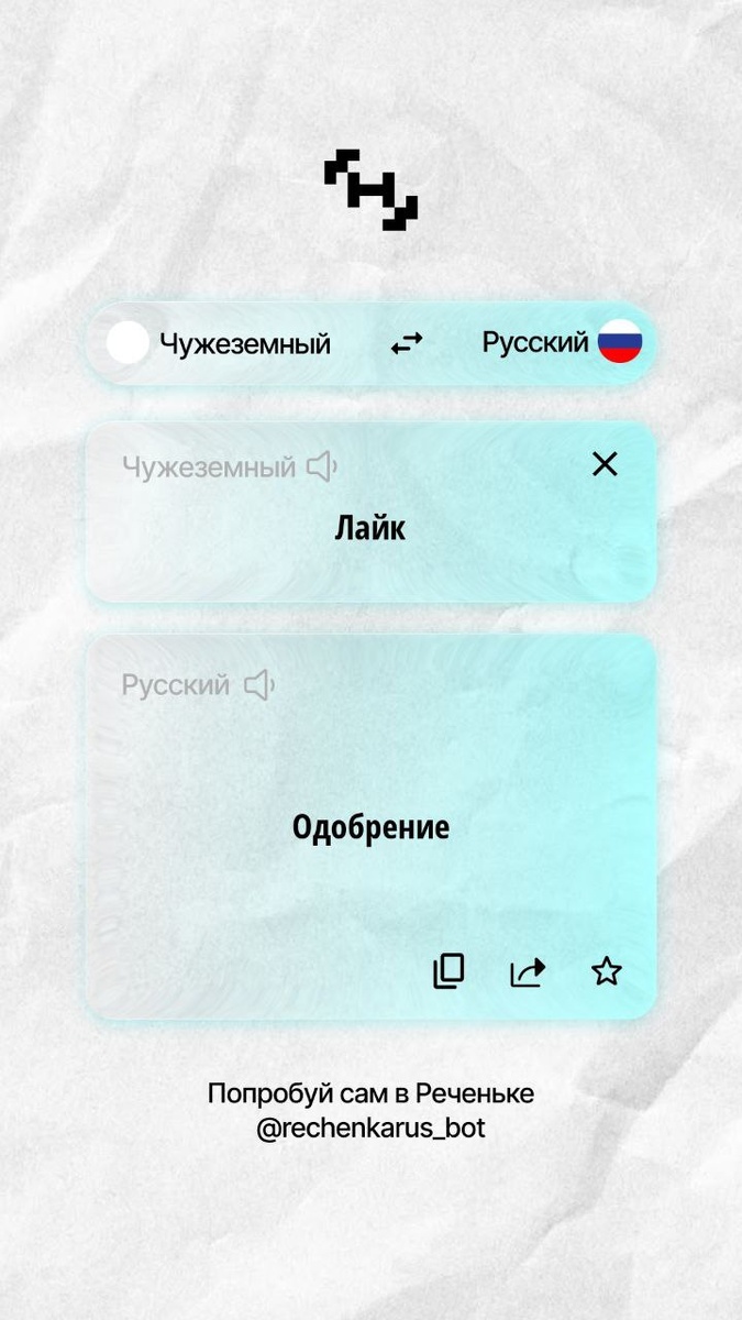 ?! 🇷🇺 За последние десятилетия в нашем языке появилось много иностранных слов и сленга. Общаясь с подростками и молодёжью, я не всегда понимаю, что они говорят… Приходится искать в интернете, что означает то или иное слово. С 1 марта закон о защите русского языка вступил в силу🇷🇺 Государство требует чистоты речи в публичном поле –давайте смотреть на это не как на ограничение, а как на повод заговорить красиво на родном языке. Наше — это ярко, живо и точно! ✨ Чтобы нужные слова всегда находились за пару секунд, сделали бота «Реченька» @rechenkarus_bot. Это не скучный академический словарь. Бот мгновенно подбирает живые, выразительные русские аналоги любым терминам и заимствованиям. Отличный спасательный круг для всех, кто пишет тексты, готовит уроки или просто хочет звучать убедительно. Открывайте и пробуйте — родной язык может сиять! С помощью бота можно даже реализовать с детьми проект «Словарь: Вспоминаем наши слова» — исследовать родной язык, находить красивые аналоги за