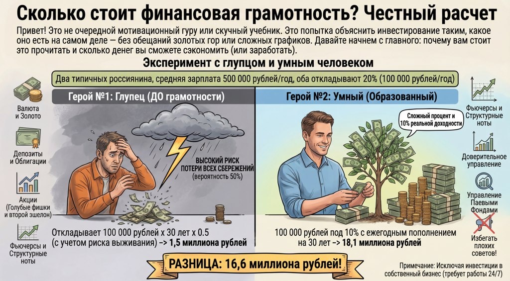 Давайте посчитаем ценность финансовой грамотности в деньгах. Возьмем двух типичных россиян со средней зарплатой (пусть будет 500 000 рублей в год, по официальной статистике). Оба откладывают по 20% дохода (100 000 рублей в год).