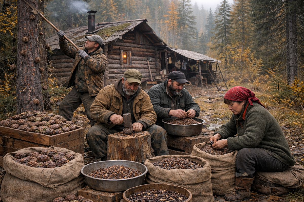 Собранное — это только половина дела. Вечером начинается вторая работа. Шишки нужно перебрать, просушить, вылущить. Мы сидим у стола, руки двигаются автоматически, разговоры идут медленно, без лишних слов. Каждый считает в уме — сколько уже, сколько ещё нужно, чтобы сезон был не зря. Орех — это деньги, это мука, это солярка, это патроны, это запас на чёрный день. В тайге всё измеряется не красивыми словами, а тем, что можно обменять или сохранить.
