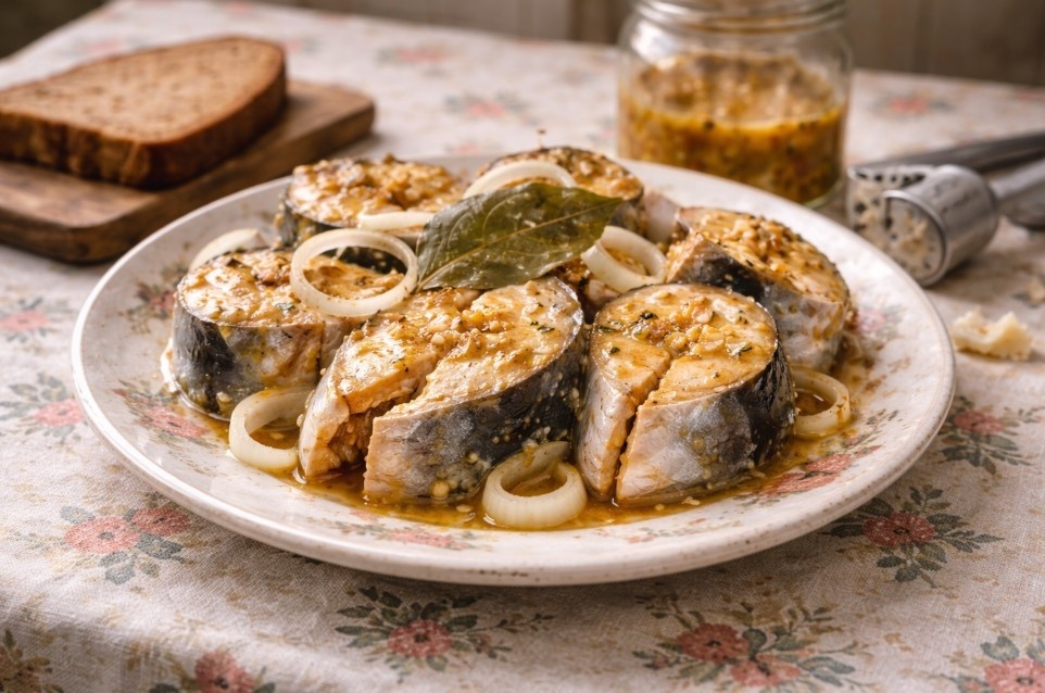 Знаете, рыбу я мариную так, как когда-то подсмотрела у тёти Зины на общей кухне. Она работала в рыбном отделе и в скумбрии разбиралась лучше всех на нашем этаже. Беру одну скумбрию, режу на порционные кусочки — не слишком тонко, чтобы не развалились. А дальше колдую над маринадом. В мисочку кладу по чайной ложке соли, сахара, горчицы и уксуса. Туда же столовую ложку растительного масла и зубчик чеснока — продавливаю через давилку, ещё мамину, алюминиевую. Перемешиваю. Половинку луковицы нарезаю полукольцами, бросаю к маринаду вместе с лавровым листочком. И вот в эту красоту отправляю рыбу, перемешиваю бережно, руками — так лучше чувствуешь, что каждый кусочек пропитался. Перекладываю в контейнер, закрываю крышкой — и в холодильник. Минимум на двенадцать часов, а лучше на целые сутки. Мой Коля, бывало, заглядывал каждый час: «Ну что, готово?» Нет, говорю, терпение — главная приправа. Через сутки достаёшь — аромат на всю кухню. Нежная, пропитанная, тает. Чтобы не забыть, записала себе на