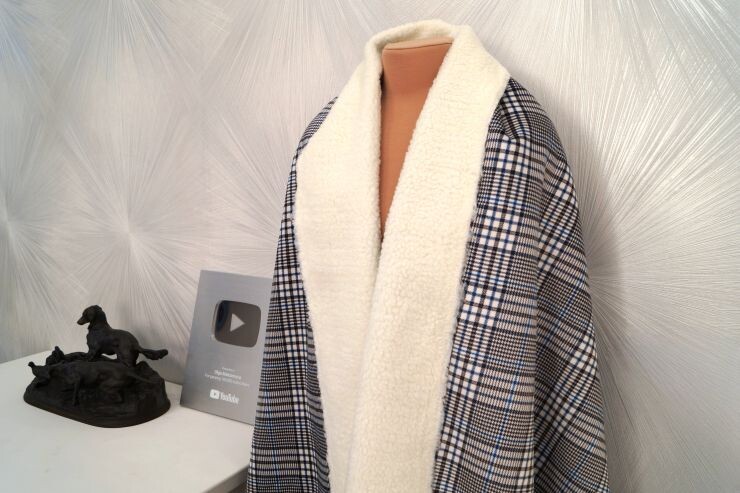 В данной статье покажу, как я шила пальто-дубленку на весну из ткани с искусственным мехом на изнаночной стороне. Пальто прямое, свободного объема, со спущенным плечом. Шить довольно быстро, так как с такой тканью подкладка не нужна. На 44 размер и рост 164 см расход ткани составил 180 см при ширине 150 см (если не в клетку, то можно уложиться и в 1,5 м). Шила по выкройке дубленки Арья с сайта «Выкройки легко» (размеры 36-64). Из изменений: увеличила карманы и изменила воротник, но об этом далее в статье. Итак, кроим детали выкройки, не забывая перенести метки с выкройки на ткань: спинка 1 деталь, полочка 2 детали в зеркальном отражении, рукава 2 детали, 2 кармана и воротник. Так как я шила из ткани в клетку, то кроила так, чтоб клетка совпадала на боковых срезах полочки и спинки, а клетка на воротнике совпадала с клеткой на спинке и т.д. На деталях полочки переносим и закрываем вытачки. Уравниваем боковые срезы полочек и спинки и стачиваем, прокладывая строчку по лицевой стороне на ра