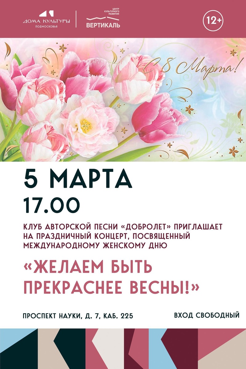 🌹 Женственные голоса Людмилы Чаркиной и Светланы Украинской из Клуба «Добролет» зазвенят строчками красивых стихов иавторскими песнями, амузыканты ансамбля порадуют мягкой инструментальной музыкой. 🕊 Вас ожидают теплые поздравления, красивые стихи ипесни, подарившие столько весеннего настроения иулыбок! 🚫 Возраст: 0+ 📆 05.03.2026 🕒 17:00 🏢 ЦРК "Вертикаль" г. Пущино 📍 г.о. Серпухов, г. Пущино, проспект Науки, 7 💰 Вход свободный❗️ ⭐Поддержать канал голосом 💰 Канал Вакансии Серпухова ✅ Мероприятия Серпухов https://dzen.ru/id/66f01c6eb4c6fe60c9ca1608 http://vk.com/serpukhov_events http://dzen.ru/serpukhov_events