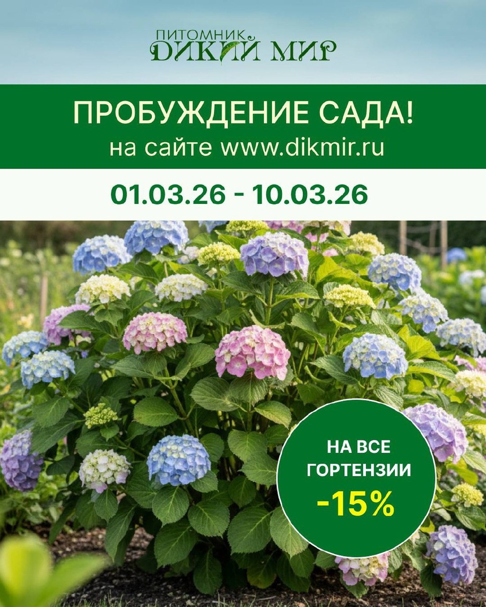 » 🌸 Март — время, когда сад просыпается. ✨ Представьте: пышные шапки нежных оттенков, долгое цветение и море комплиментов от гостей. 🌿 Специальное предложение: скидка 15% на все гортензии в нашем питомнике! Условия акции: 🗓 Период: с 1 по 10 марта 2026 года. 🚚 Доставка по всей России: по предварительной договоренности мы отправим заказ в удобное для вас время. 👉 Переходите на сайт по ссылке: https://clck.ru/3Mm8XU и выбирайте любимые оттенки и формы!