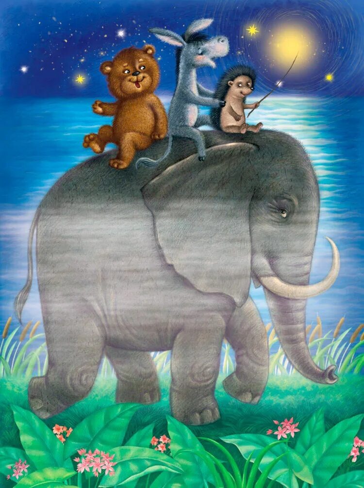 Слон пододвинулся к пеньку, и Ёжик первый вскарабкался на него, а за ним — Ослик и Медвежонок. В лапе у Ёжика была палочка для грибов, он сидел ближе всех к голове Слона и поэтому стал главным.