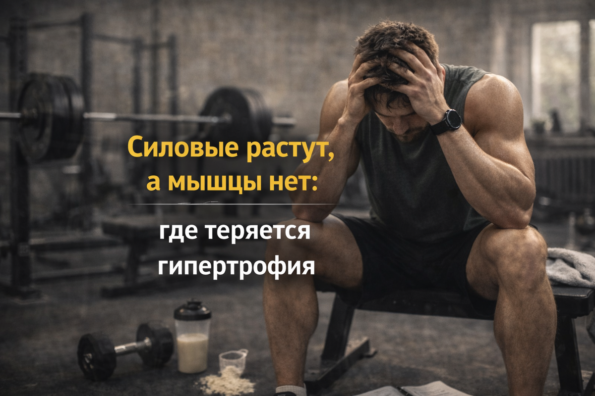 Это одна из самых частых ситуаций у тренирующихся мужчин 25–40 лет: сила прогрессирует, а визуальный объём отстаёт. Причина чаще всего не в «плохой генетике», а в физиологии адаптации.