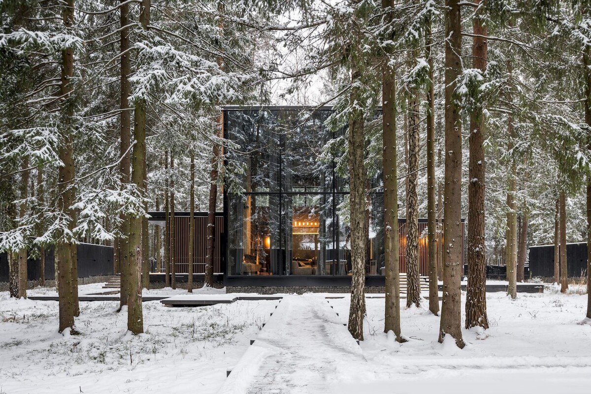 Дом, образ которого построен на сочетании тяги к простоте и аскетизму с любовью к высокой степени комфорта и дорогому окружению. Иногда в архитектурном проекте самое сложное — нащупать «то самое» единственно верное решение с учетом места, образа жизни и характера заказчика, особенно, если он сам не знает, что именно ждет. Заказчик дома — топ-менеджер медийной компании— в своих пожеланиях разрывался между жаждой крайней простоты, едва ли не аскетизма (всерьез звучали описания в стиле «домик егеря») и привычкой к комфорту и дорогому окружению. «Все, что было у архитекторов в начале проекта, — это хвойный лес и участок. Поэтому задача была простая и одновременно сложная: построить "дом в лесу"». Из этих вводных родился лаконичный по своей архитектуре и интерьерным решениям дом, где желанная аскетичность и некоторая брутальность сочетаются с роскошью, которая здесь проступает в красоте больших открытых пространств, панорамных окон и тонко подобранных, неброских, но дорогих материалов. Вне