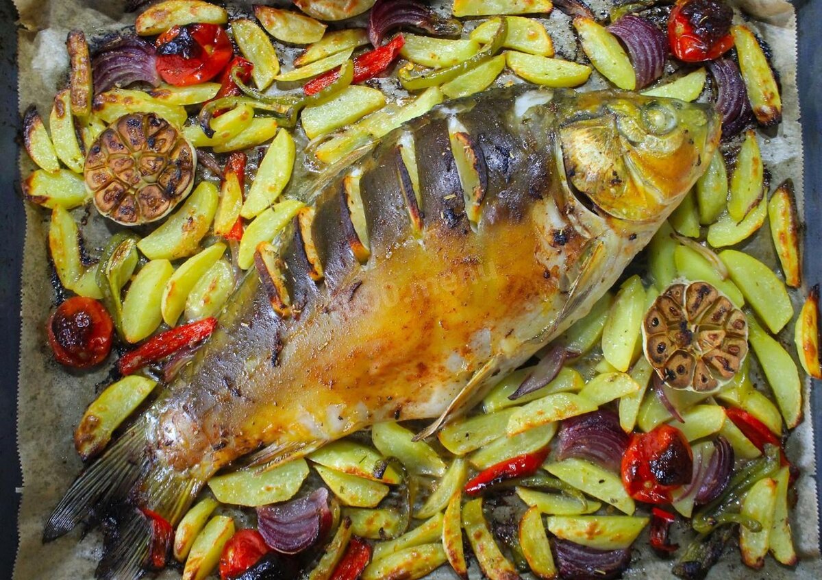 Карп, запечённый в духовке с овощами — это сытное и ароматное блюдо, которое готовится просто и быстро.