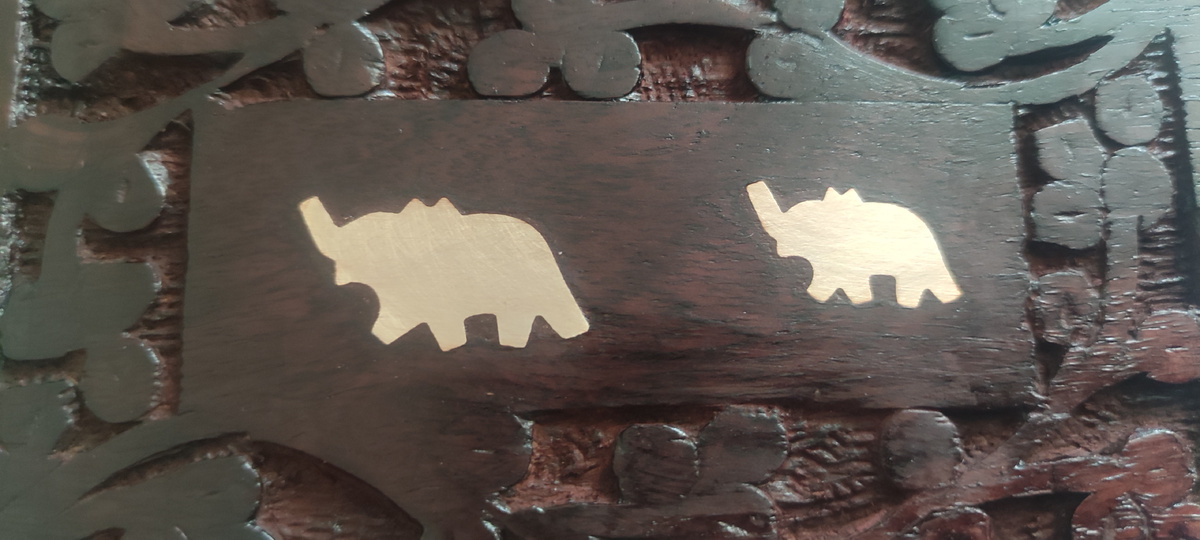 Как вы уже заметили на фотографии - есть на крышке небольшая "инкрустация" в виде слонов. Этой темы и решил придерживаться. Понимая, что с неровностями и геометрией корпуса я ничего не сделаю, то решил себя оправдать новомодным понятием 🤭🤣 - аутентичность .... Проще говоря, оставлю неровности как есть. Только добавлю декора и обработаю дерево заново, более качественно и на дольший срок службы.
